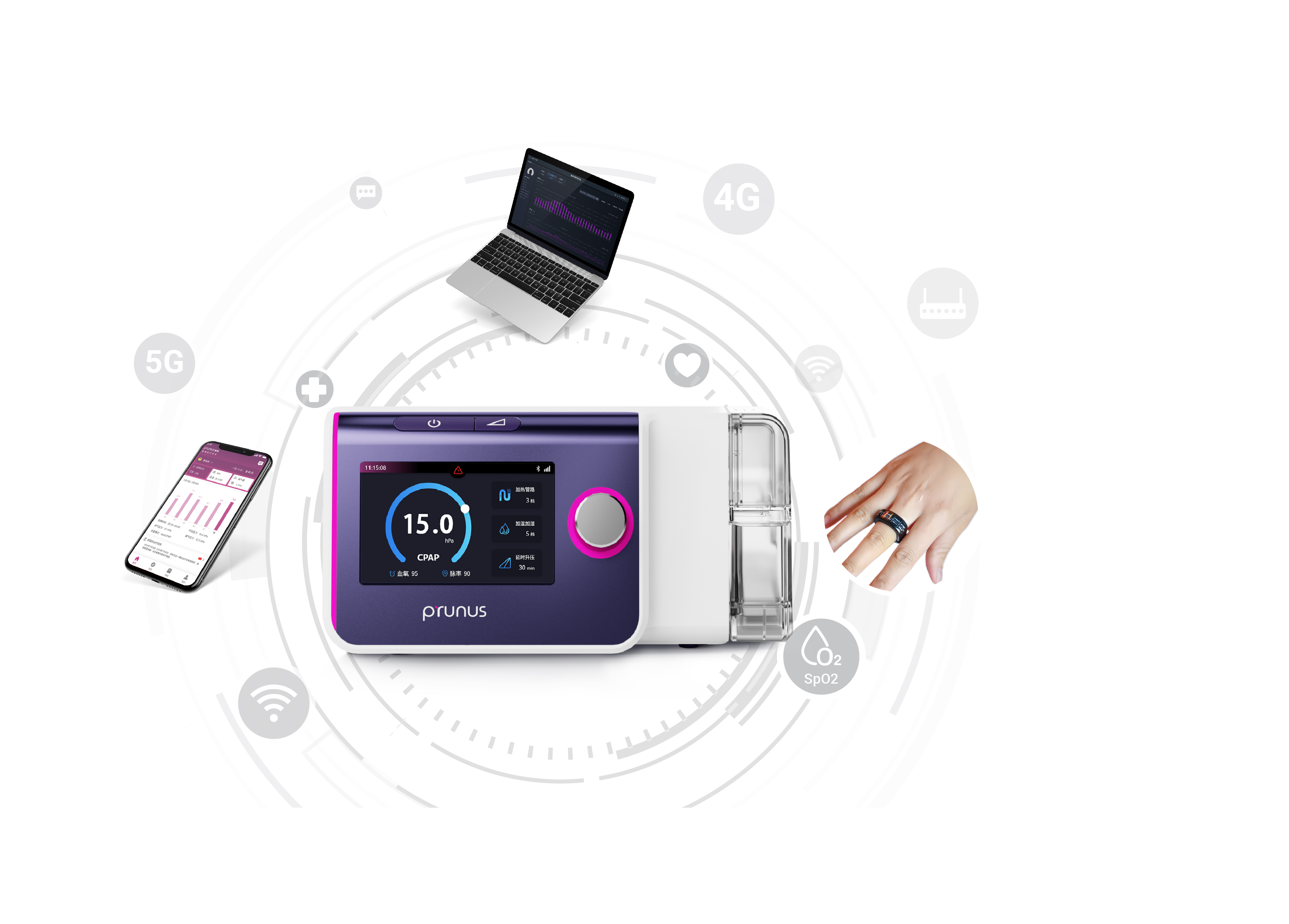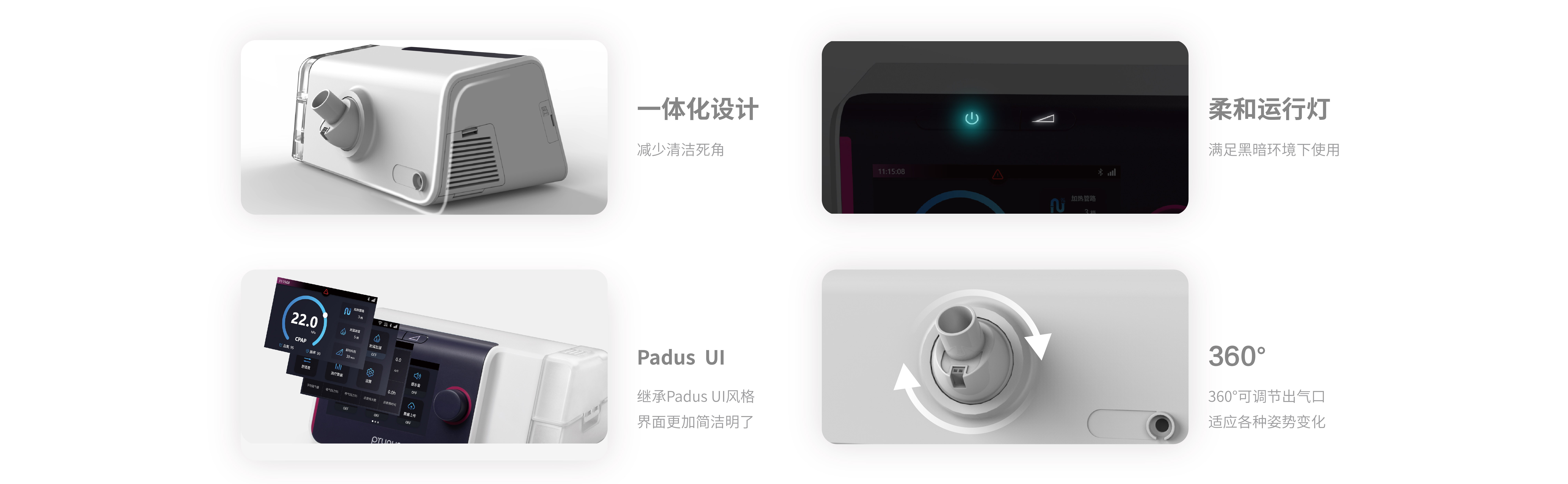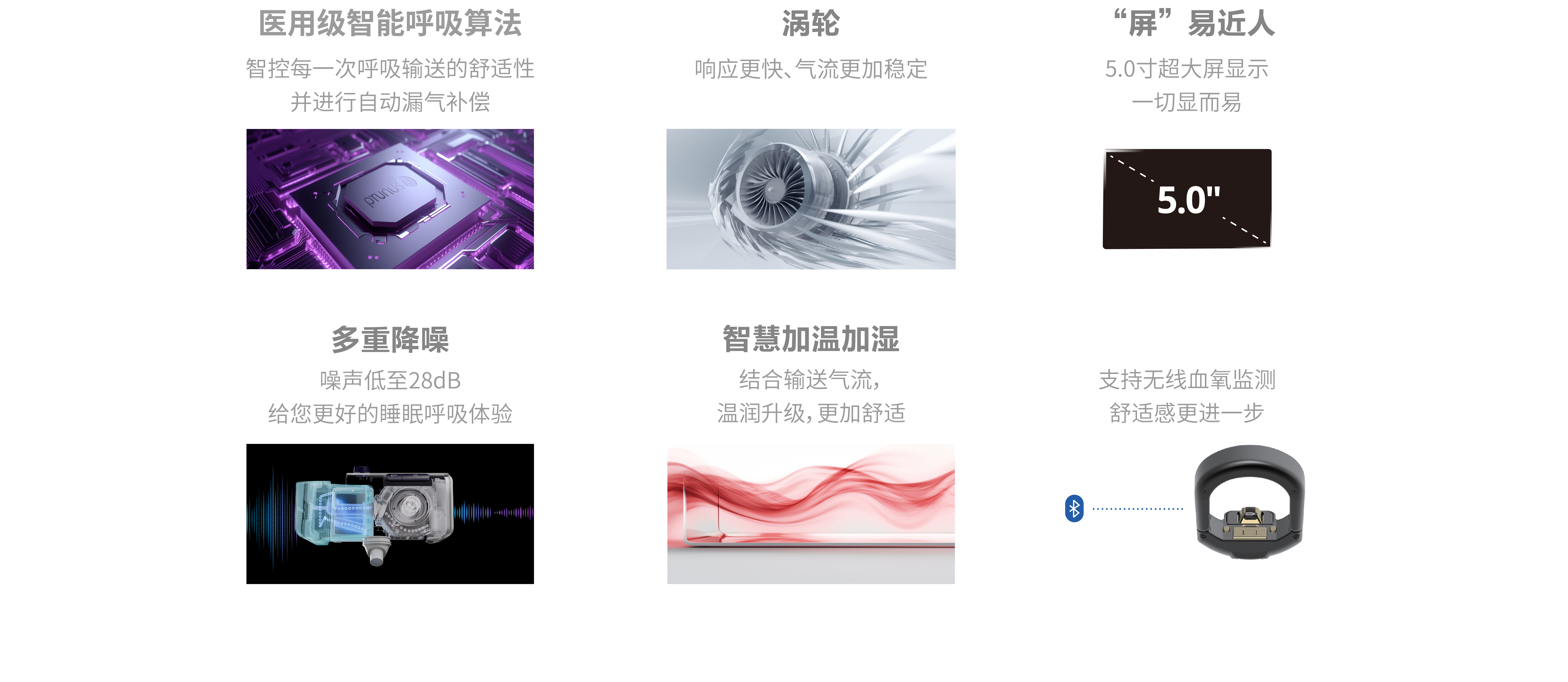 Q系列家用呼吸机医用级智能呼吸算法;智控每一次呼吸输送的舒适性,并进行自动漏气补偿。