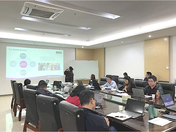 总部9楼会议室,国际营销中心总监Mr Xu正在进行引人入盛的演讲,眼神专注坚毅,思维严谨缜密,同时又不失幽默风趣,收割了一波又一波掌声。